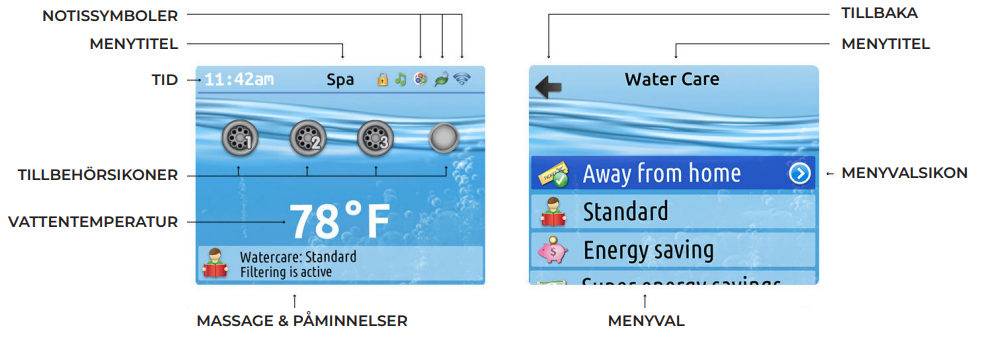 - Inkopplingen sker i kontrollboxen i spabadet. Elschema finns tillgängligt i locket på kontrollboxen eller i en plastficka baktill på enheten. Ingen ombygling behöver göras då alla spabad kommer förberedda för svensk marknad.